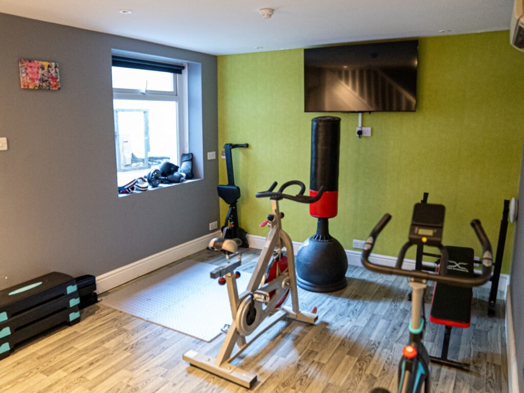 The home features two comfortable living rooms, a separate dining room, a gym, and a well-equipped kitchen – all styled with calming coastal-themed décor to reflect its seaside location.